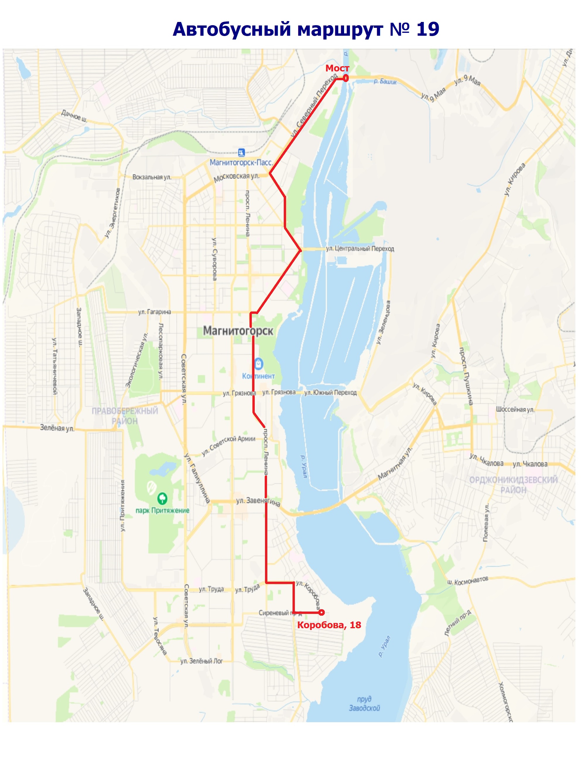 Маршрут № 19 – улица Коробова – проезд Сиреневый – улица Калмыкова – улица Труда – проспект Ленина – улица Гагарина – улица Октябрьская – улица Строителей – улица Николая Шишки – улица Московская – Северный переход и обратно.