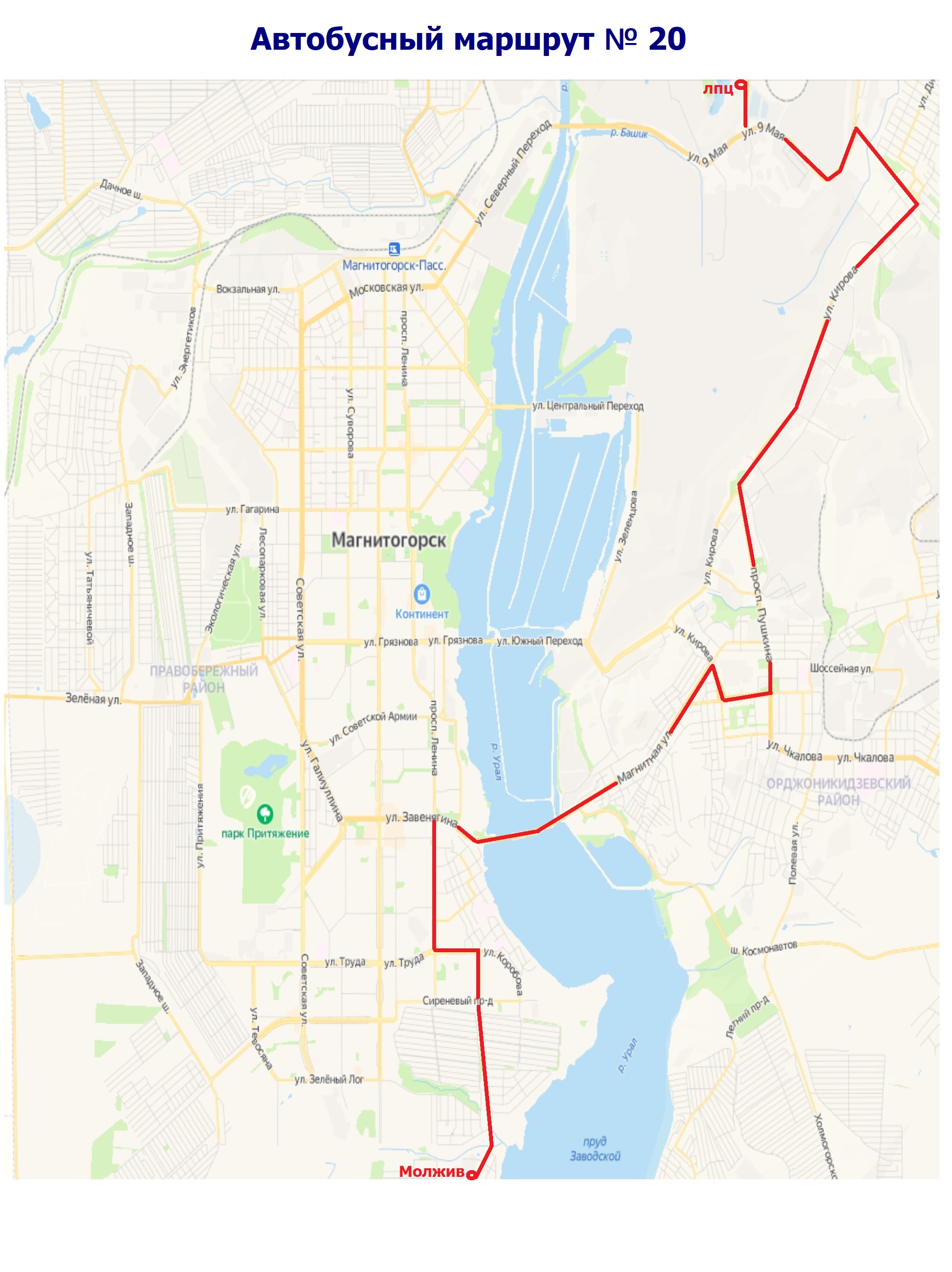 Маршрут № 20 – улица Калмыкова – улица Труда – проспект Ленина – улица Завенягина – улица. Магнитная – улица Кирова – улица Маяковского – проспект Пушкина – улица Кирова – улица Пржевальского – улица 9 Мая – шоссе Верхнеуральское и обратно.