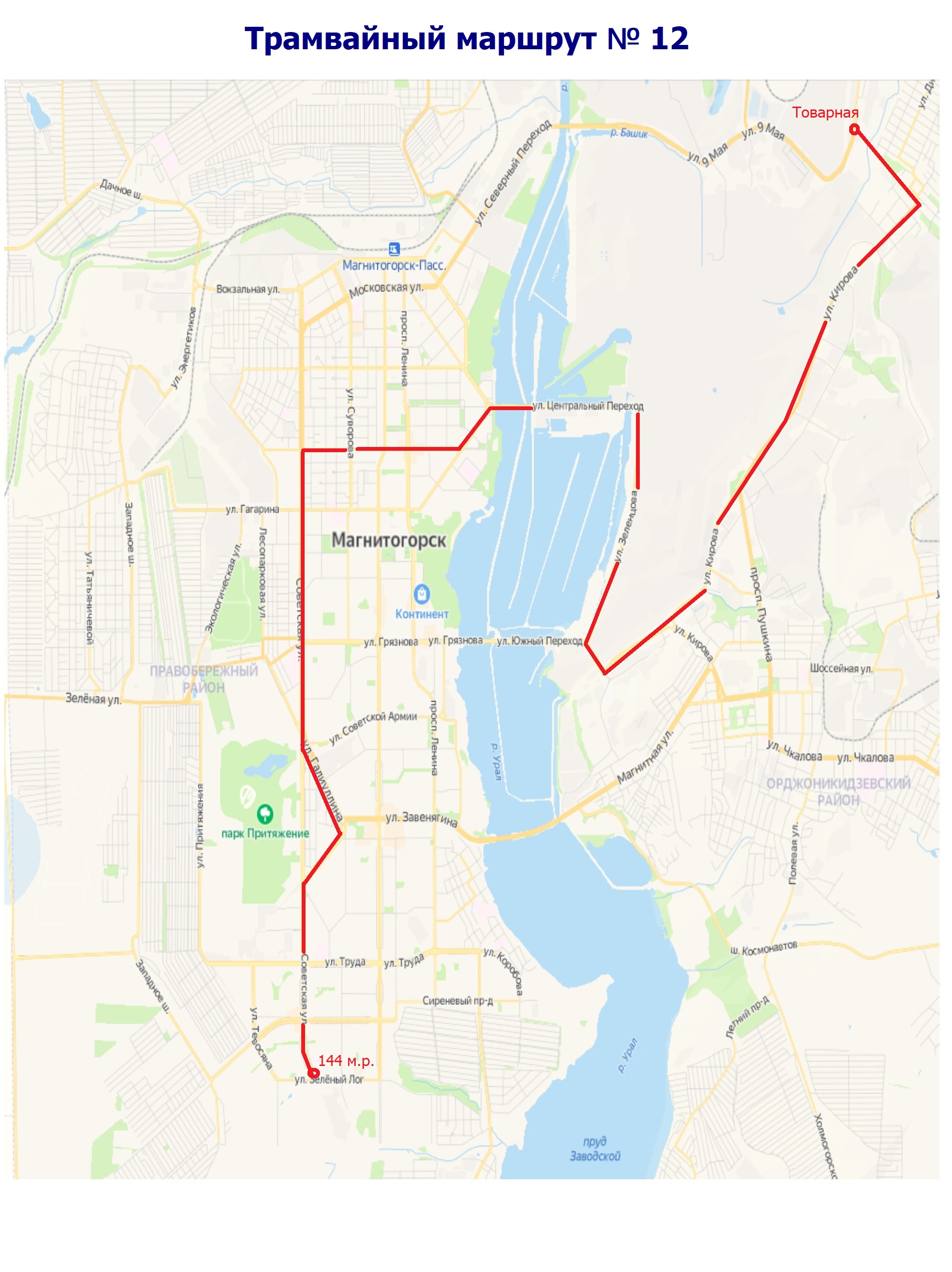 Маршрут № 12 – к/п «Зеленый Лог – улица Советская – улица Ленинградская – Центральный переход – Профсоюзная – Прокатмонтаж – Башик – Товарная» и обратно.