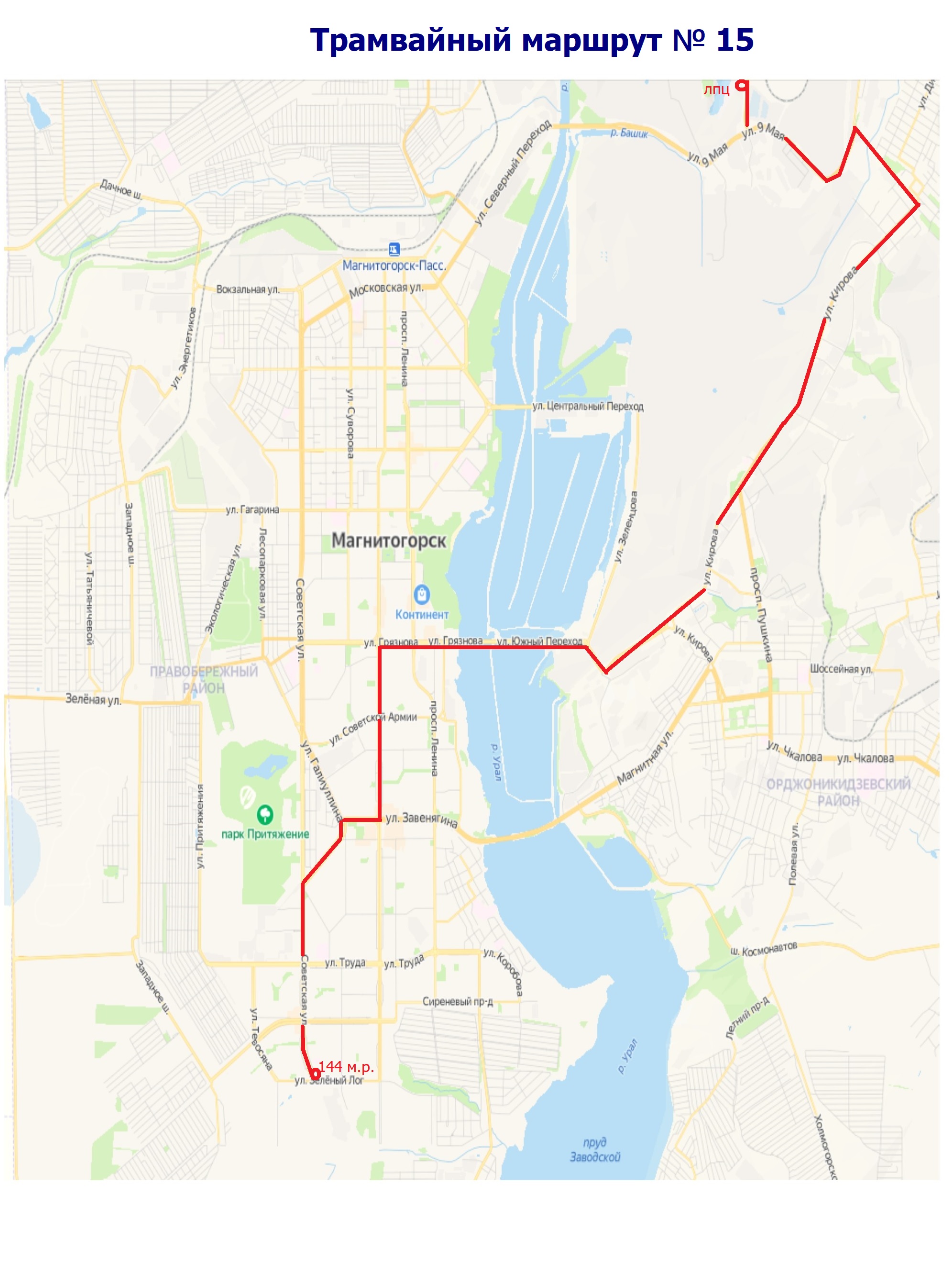 Маршрут № 15 – к/п «Зеленый Лог – улица Советская – улица Галиуллина – улица Завенягина – проспект Карла Маркса – Южный переход – Профсоюзная – Прокатмонтаж – Башик – ЛПЦ» и обратно.
