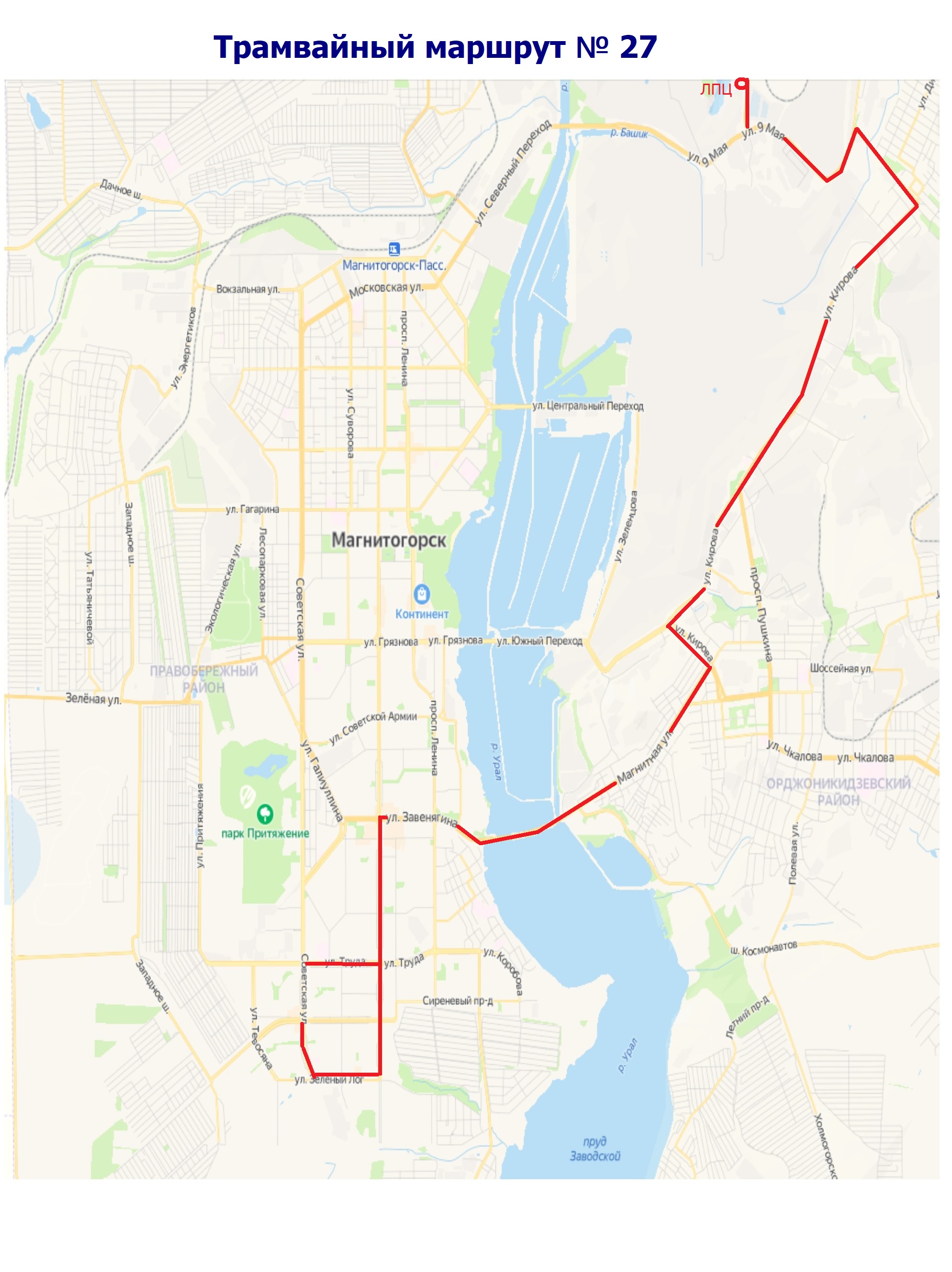Маршрут № 27 – к/п «Зеленый Лог – улица Советская – проспект Карла Маркса – Казачья переправа – Прокатмонтаж – Башик – ЛПЦ» и обратно.
