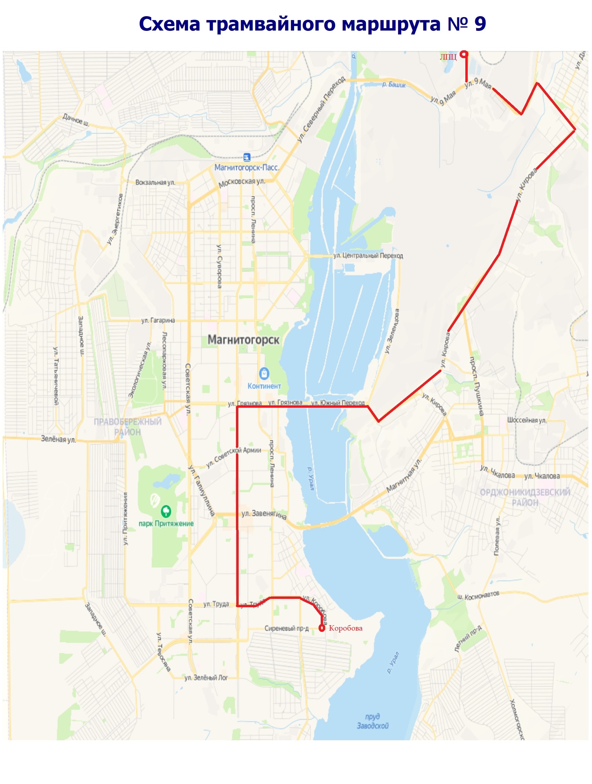 Маршрут № 9 – к/п «Коробова – проспект Карла Маркса – Южный переход – Профсоюзная – Прокатмонтаж – Башик – ЛПЦ» и обратно.