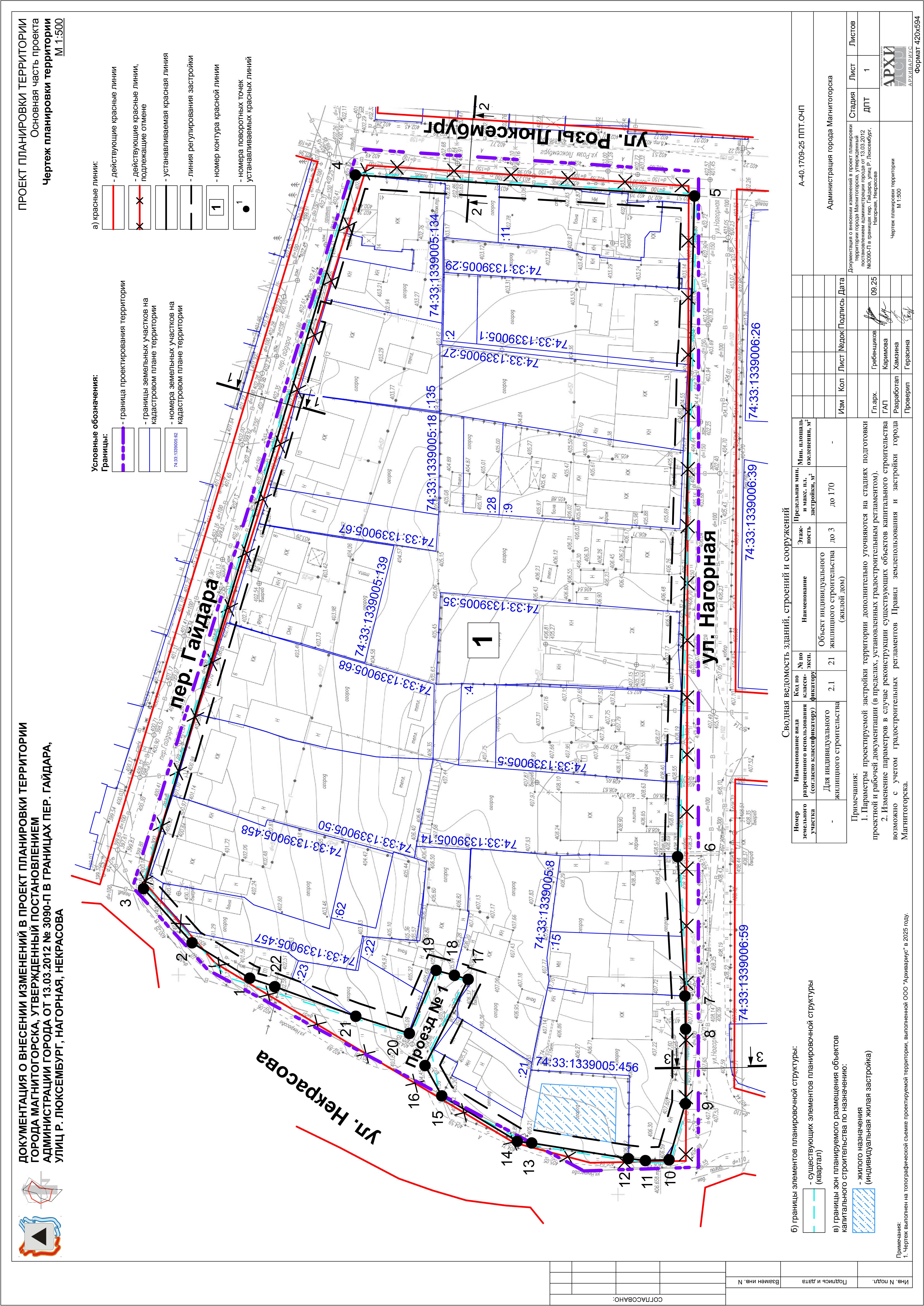 Документация о внесении изменений в проект планировки территории города Магнитогорска, утвержденный постановлением администрации города от 13.03.2012 № 3090-П, в границах пер.Гайдара, улиц Р.Люксембург, Нагорная, Некрасова
