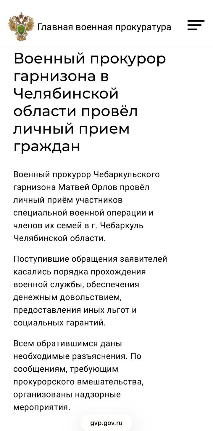 Военный прокурор Чебаркульского гарнизона Матвей Орлов провёл личный приём участников специальной военной операции и членов их семей в г. Чебаркуль Челябинской области.