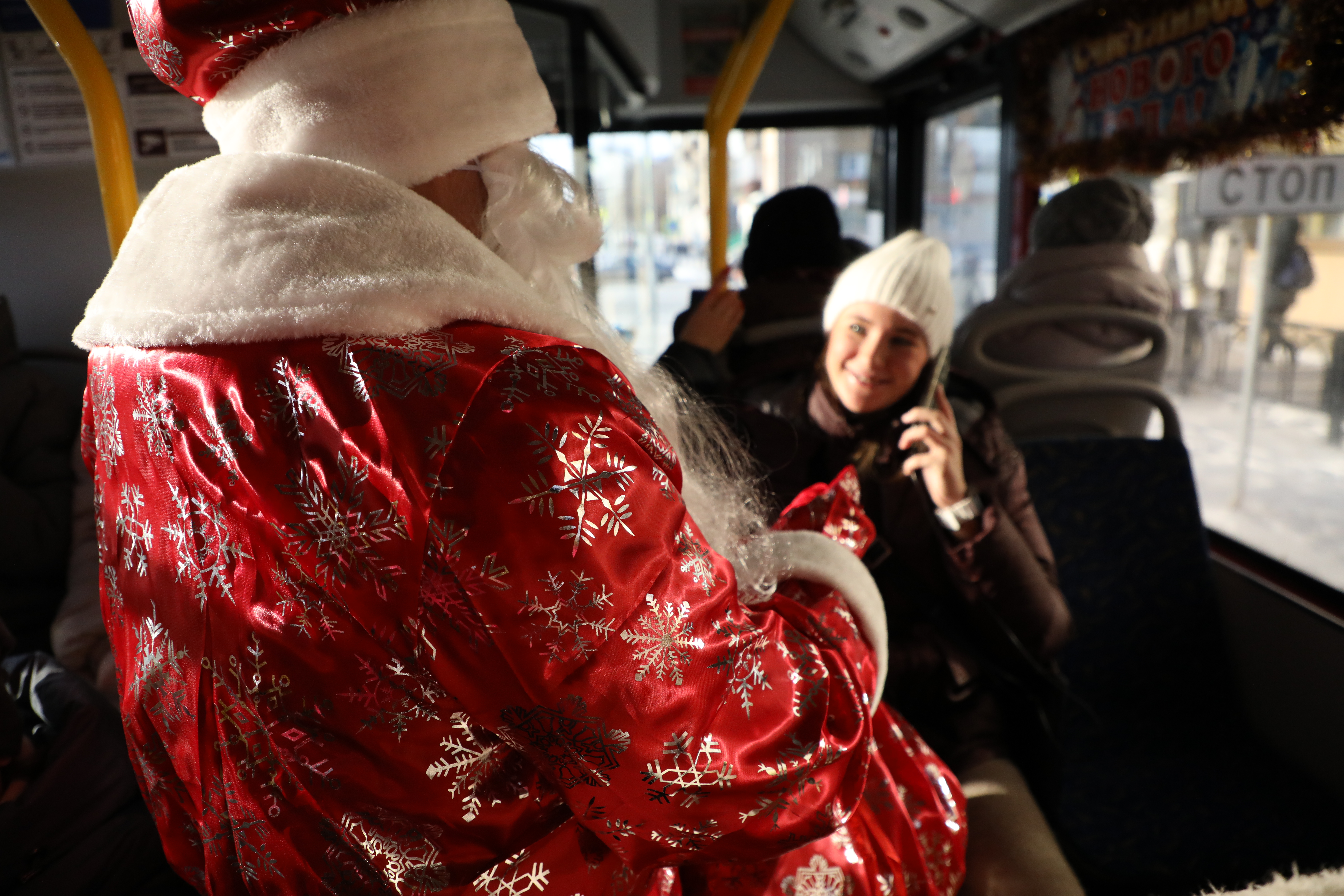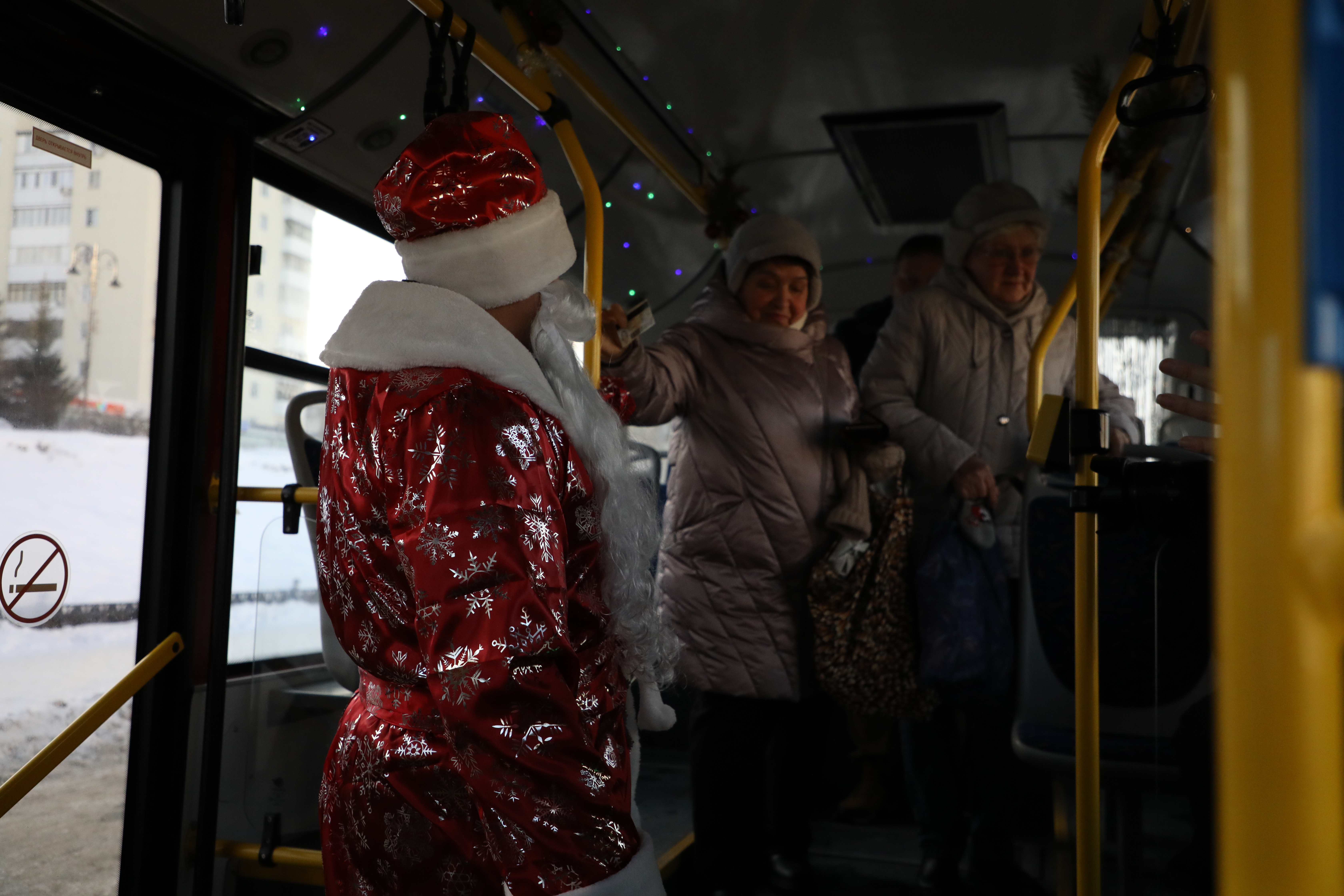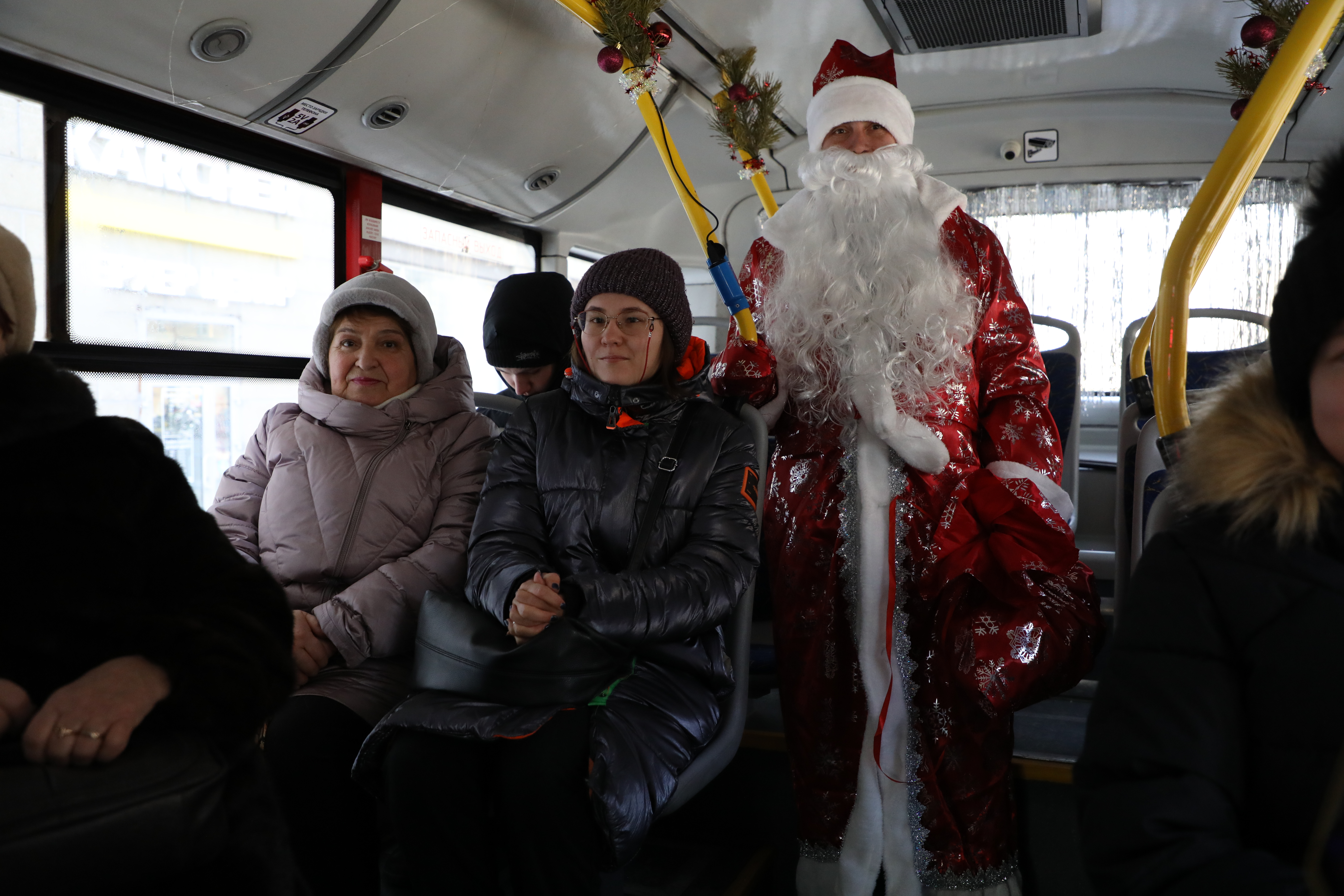 Приятно удивляет оформление салона автобуса: окна украшает мерцающая гирлянда, сверкание серебристых нитей мишуры создает атмосферу настоящей сказки. Но самое главное украшение автобуса - конечно же, сам Дедушка Мороз, радостно встречающий каждого пассажира.