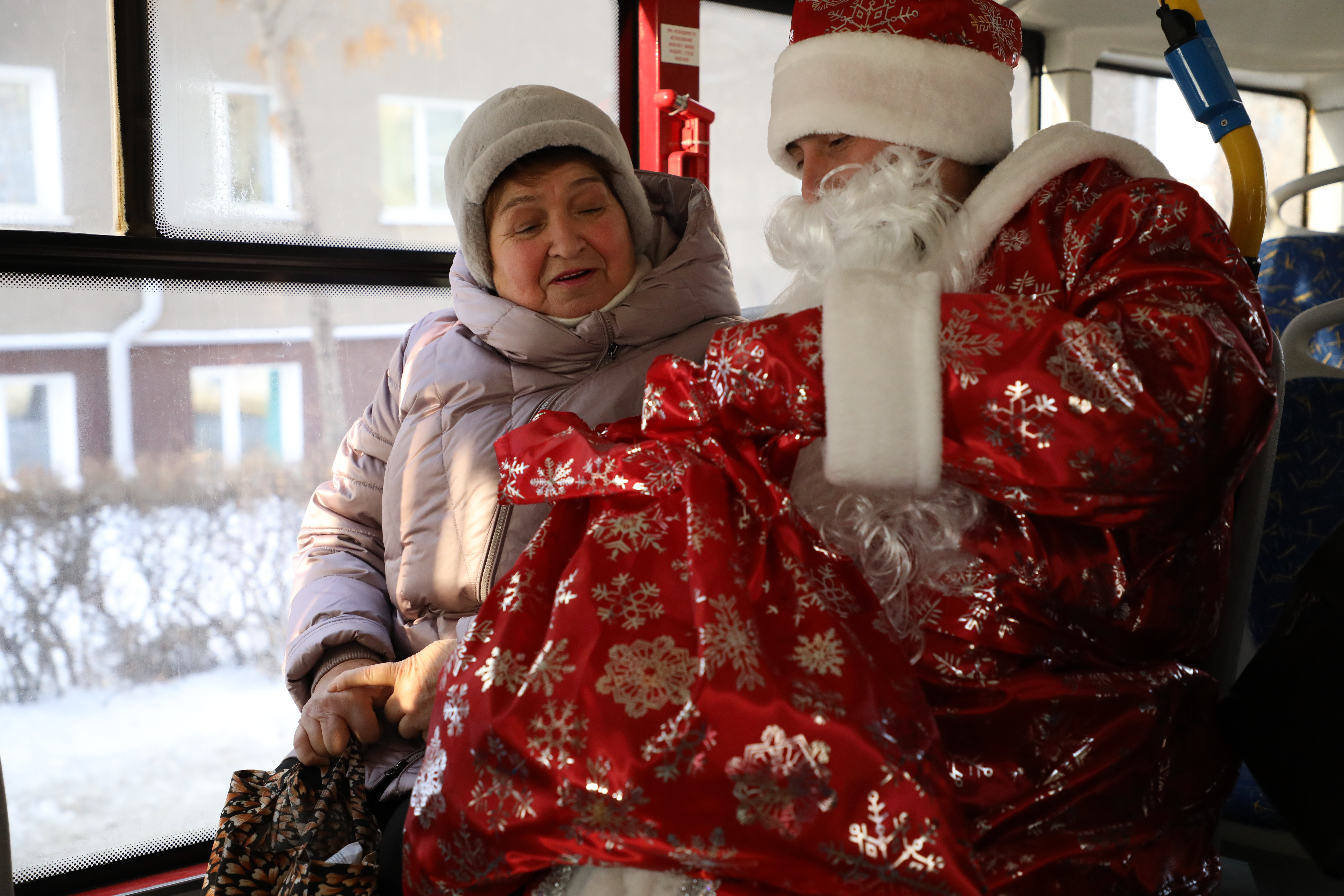 Поездка на таком автобусе подарит горожанам не только хорошее настроение. Ведь Дед Мороз вручает каждому пассажиру небольшой сладкий подарок.