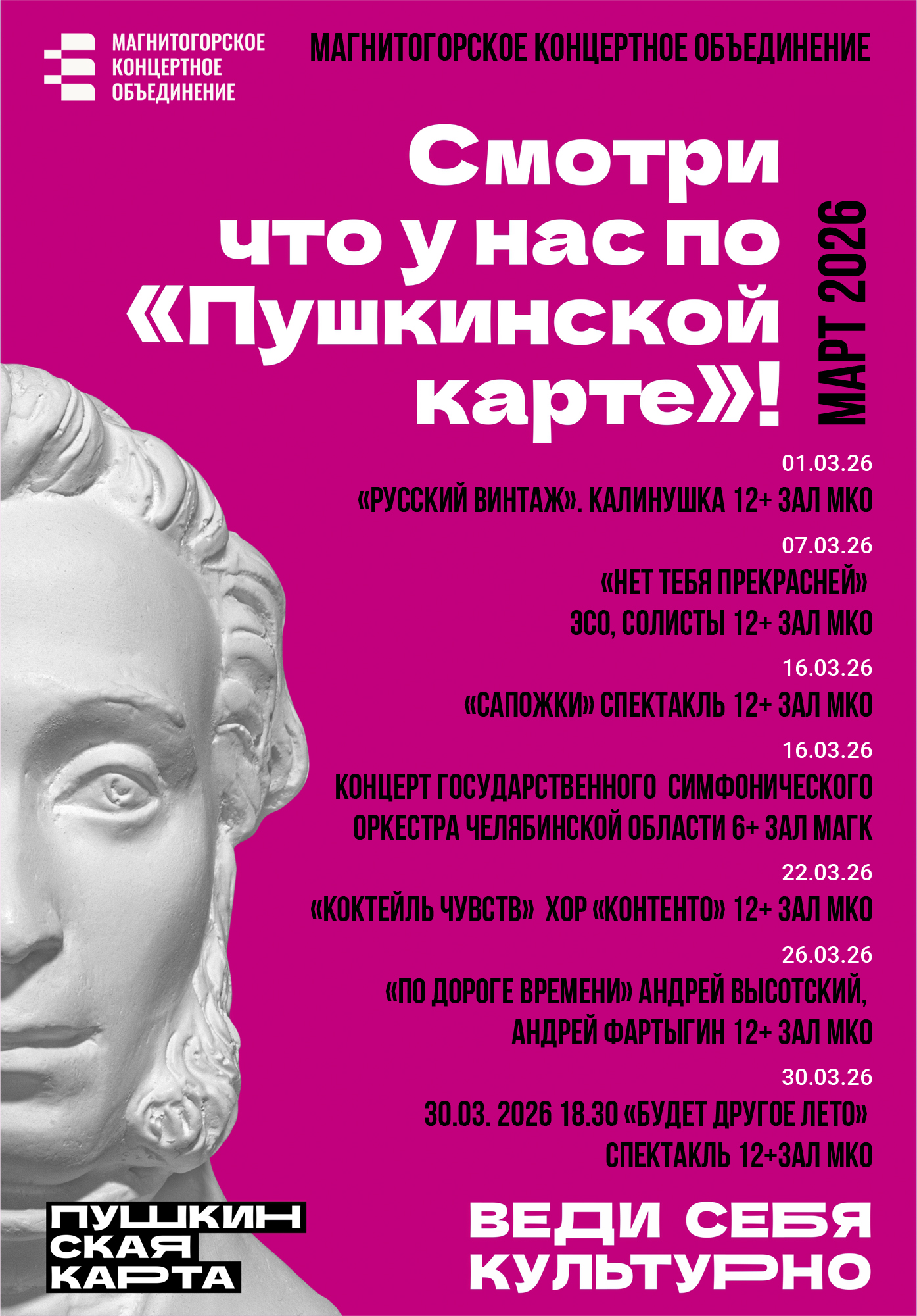 С мероприятиями, доступными по «Пушкинской карте» молодым магнитогорцам в марте 2026, можно ознакомиться ниже.