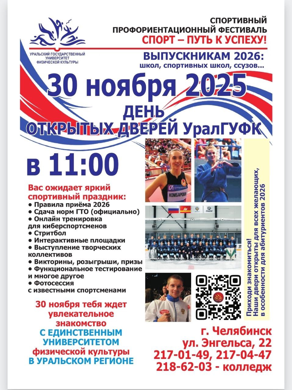 День открытых дверей состоится 30 ноября 2025 года в 11:00 в учебно-тренировочном комплексе «Манеж» Уральского государственного университета физической культуры по адресу: г. Челябинск, улица Энгельса, 22.