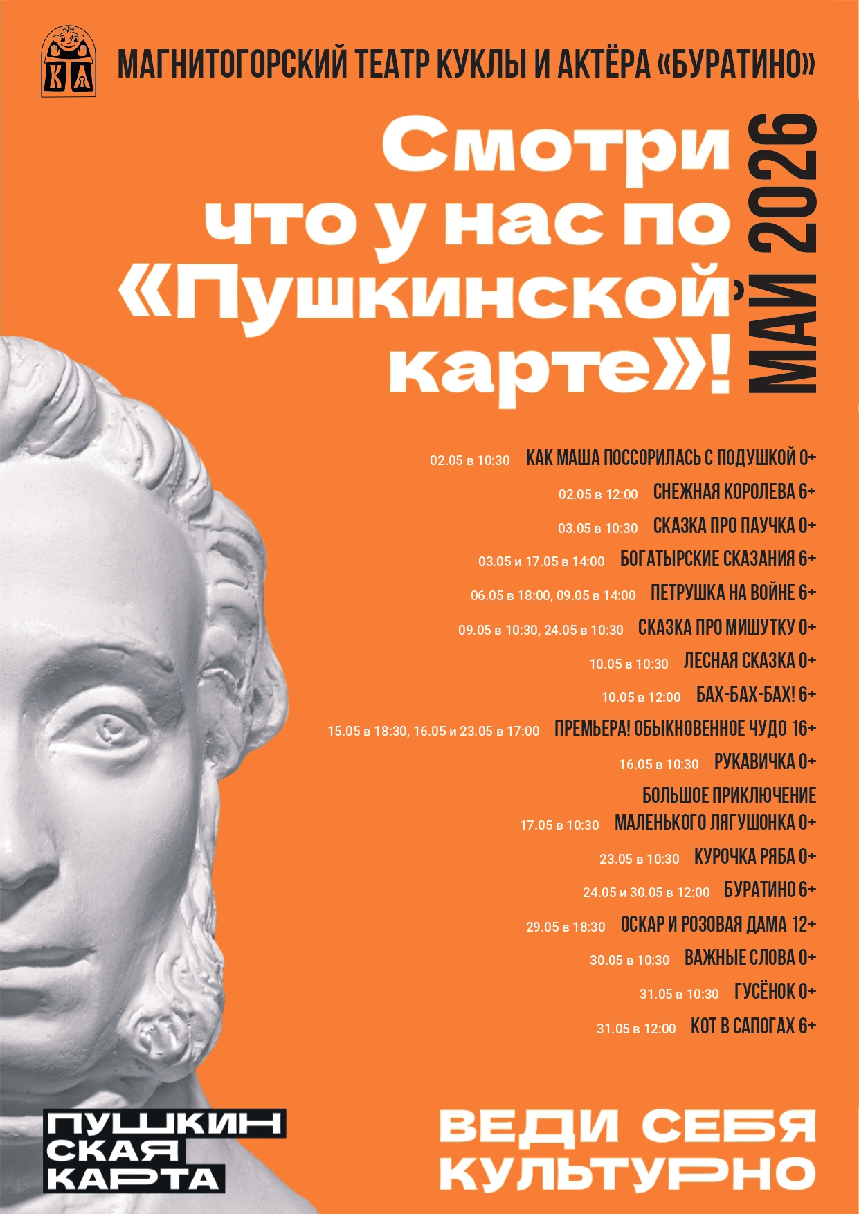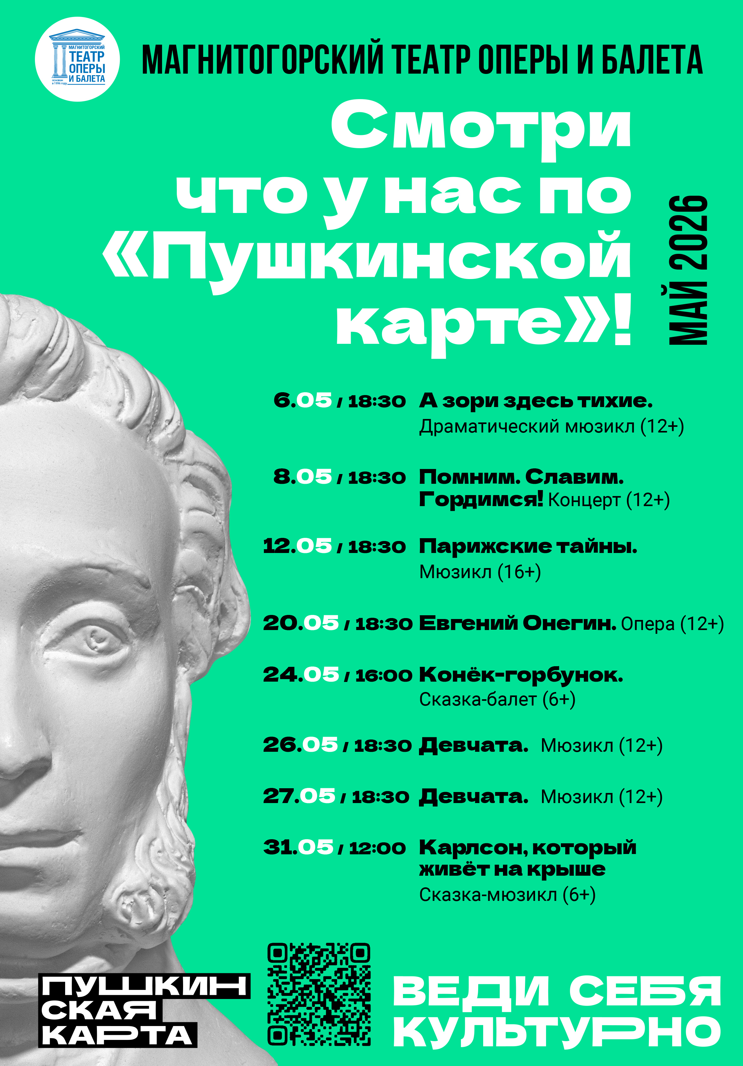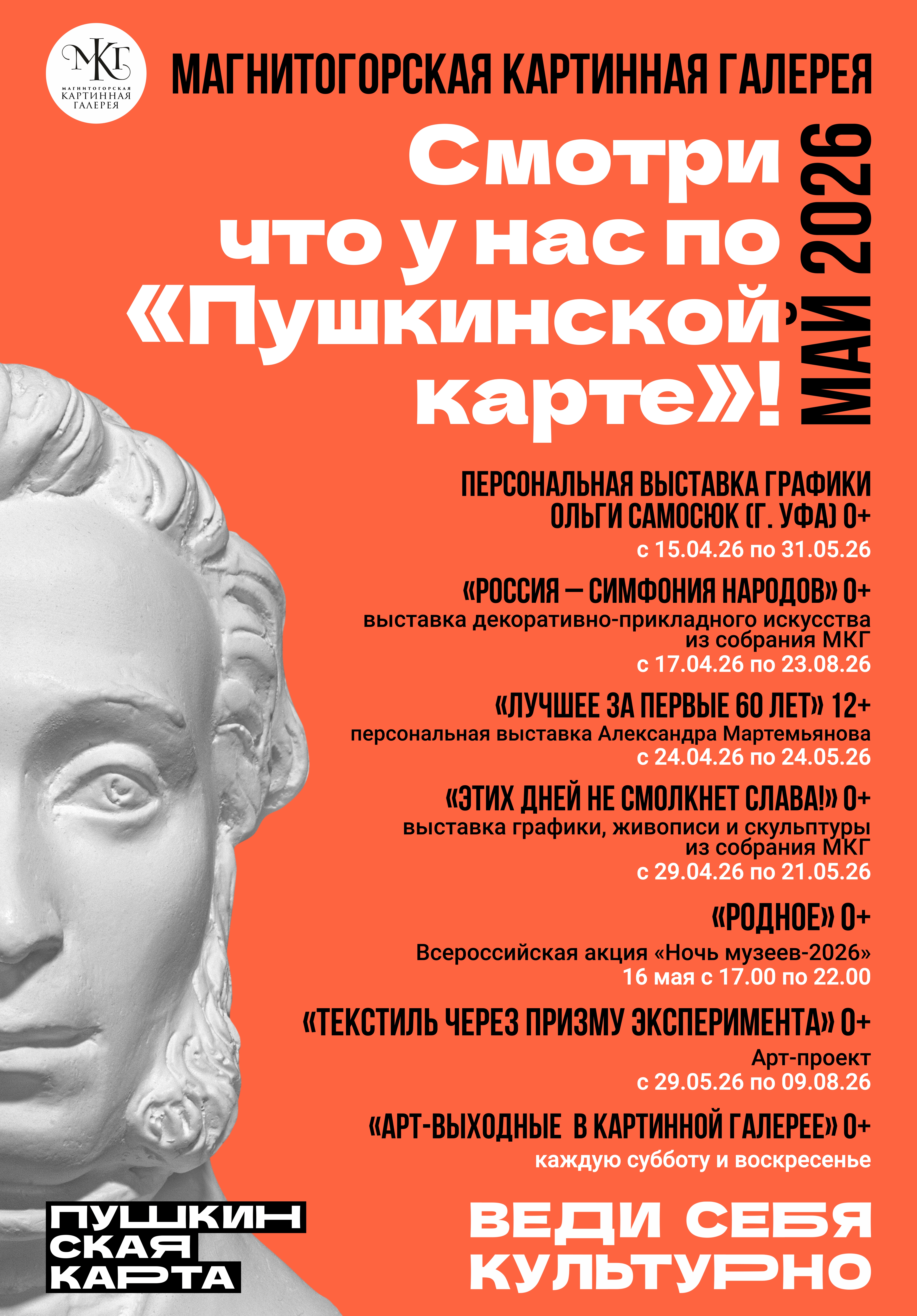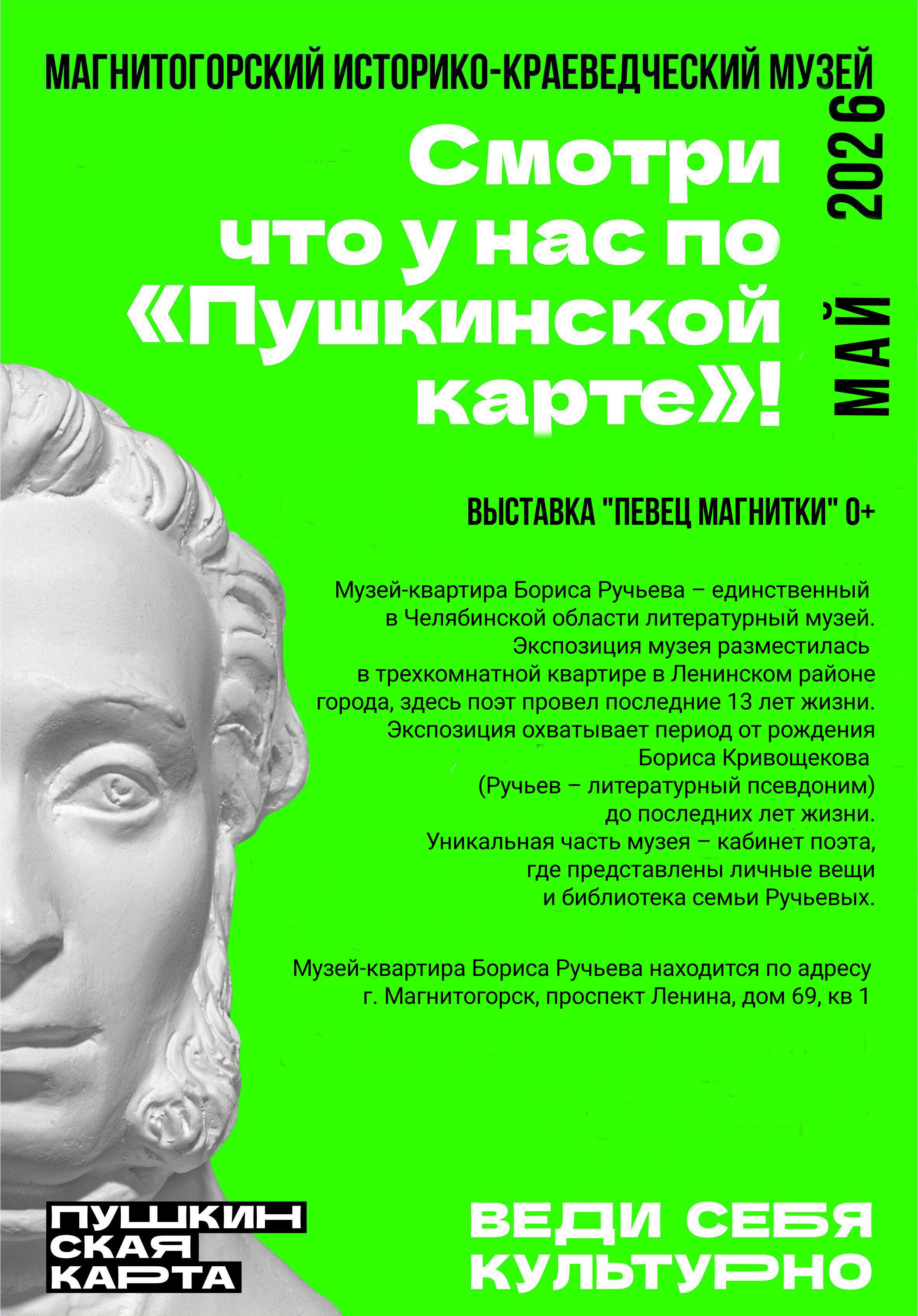 С мероприятиями, доступными по «Пушкинской карте» молодым магнитогорцам в мае 2026, можно ознакомиться ниже.