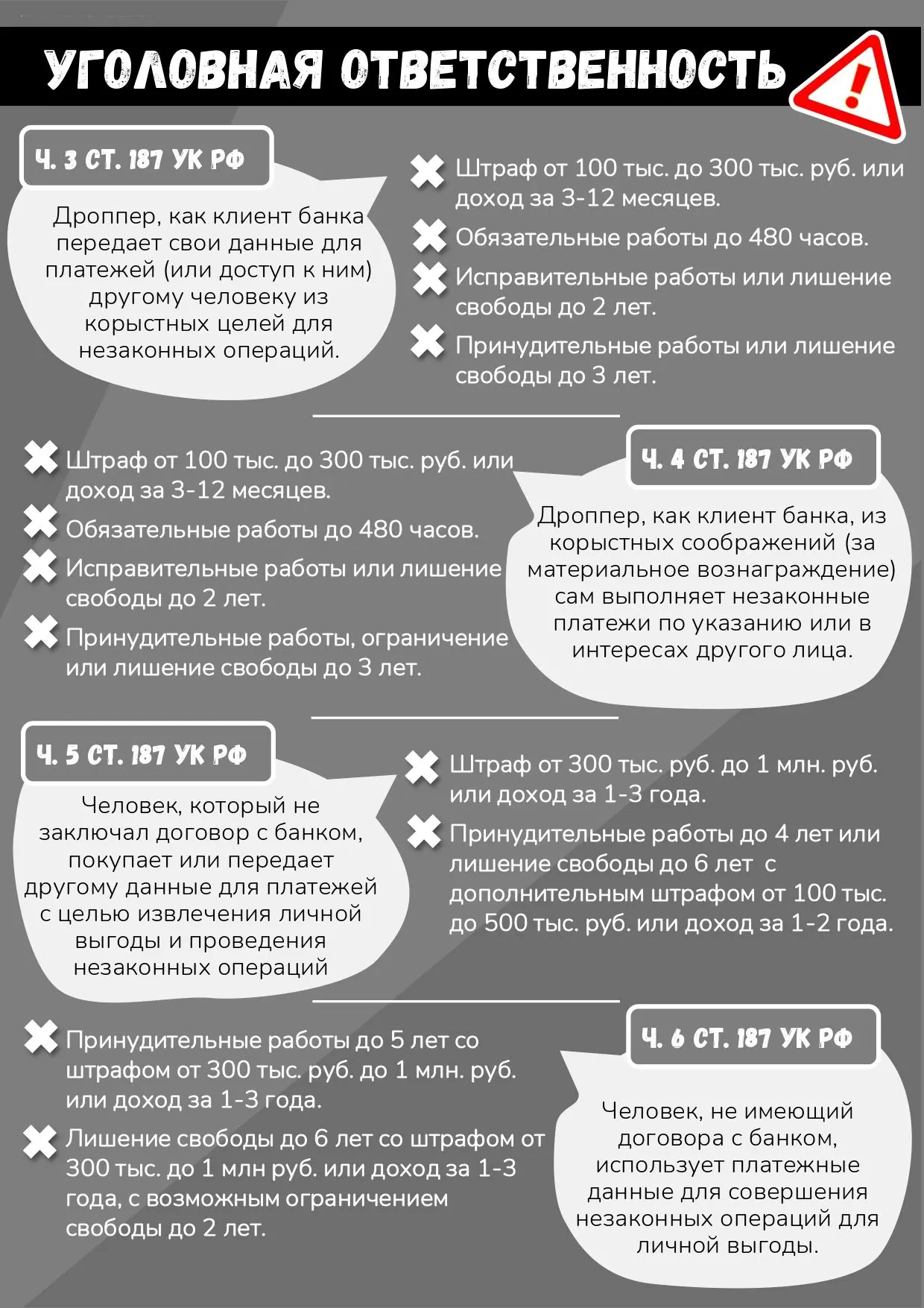 Согласно статье 187 Уголовного кодекса РФ за дропперство предусмотрена уголовная ответственность - штраф, принудительные работы или лишение свободы до 6 лет.